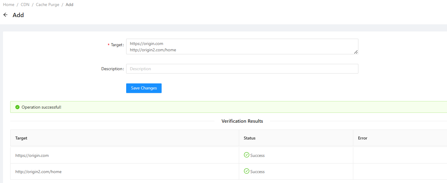 Cache Purge Can be performed under the CDN > Cache Purge > Add section.