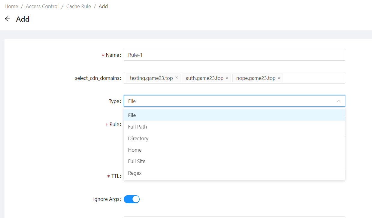 Each Type defines a specific pattern for caching, and its corresponding Rule field must be filled accordingly. Hover over the Rule input box for guidance tailored to the selected type.