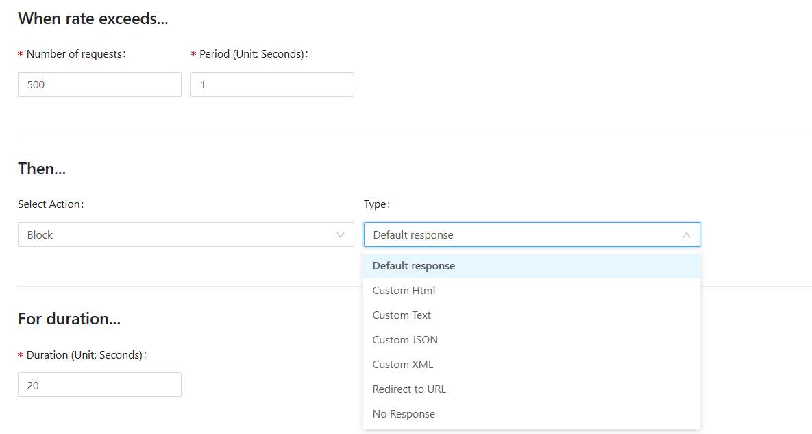 Once the threshold is exceeded, a Block response is triggered. The Type can be customized with various response types: