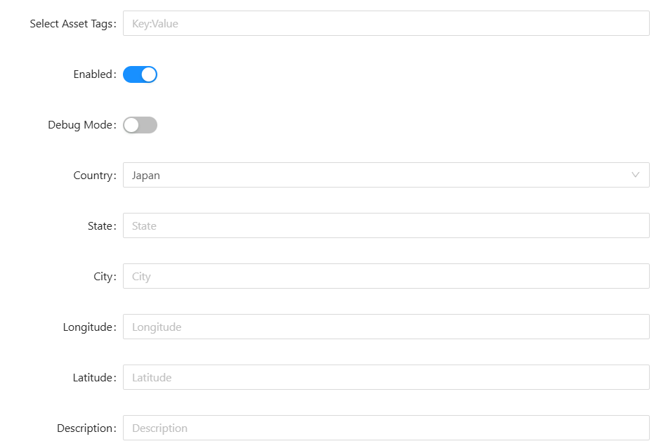Field Label Description Select Asset Tags Select from dropdown list to assign predefined Tag Value Enabled Toggle switch to enable or disable the Server. Debug Mode Toggle switch to activate debug mode. Country Dropdown to select the country State Input field to enter the state or province. City Input field to specify the city. Longitude Input field for the geographic longitude Latitude Input field for the geographic latitude Description Text field to provide additional details