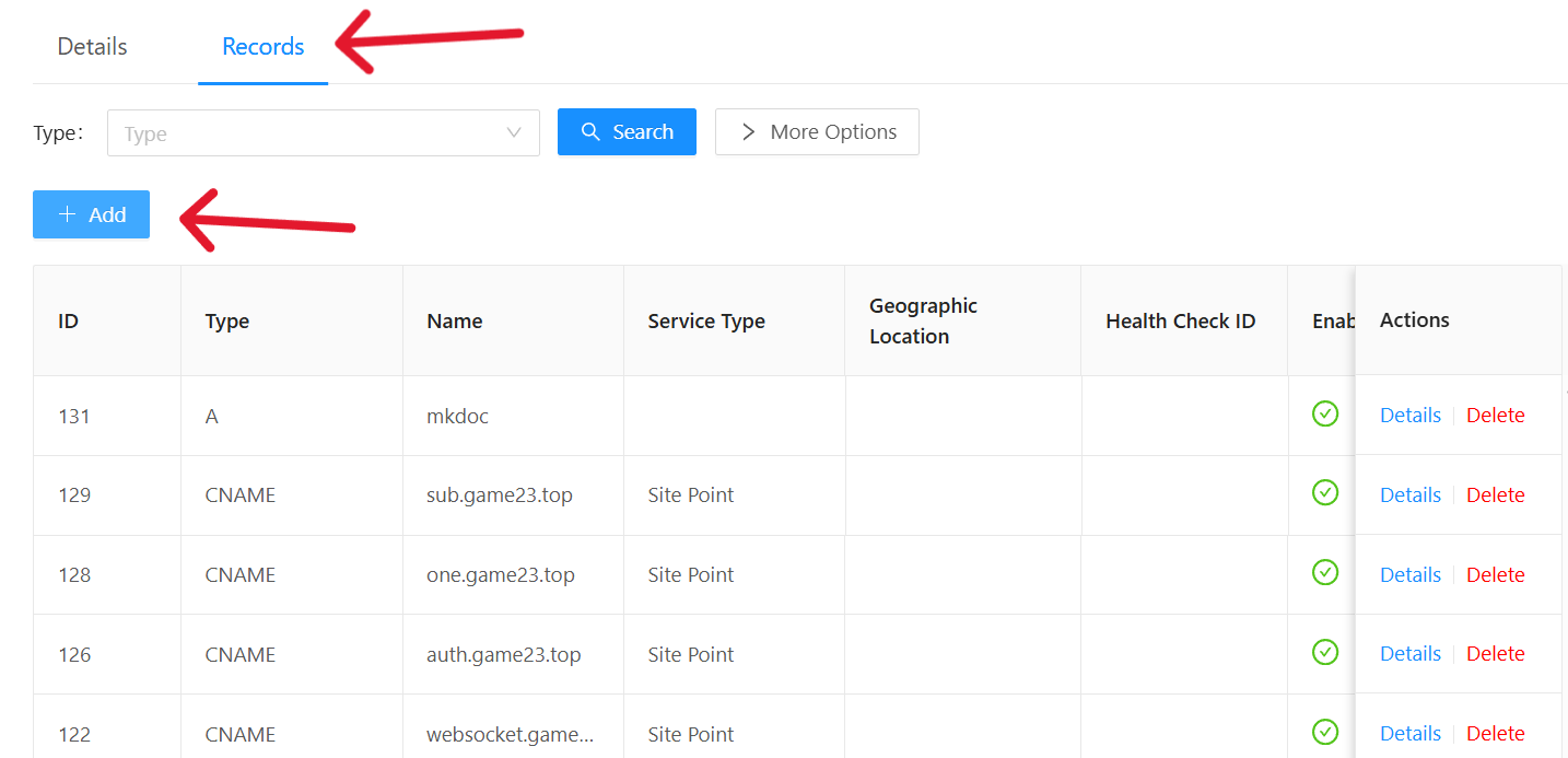DNS > Domain > Details > RecordsSection of the Coresponding Domain. Click onAddto define new DNS Record