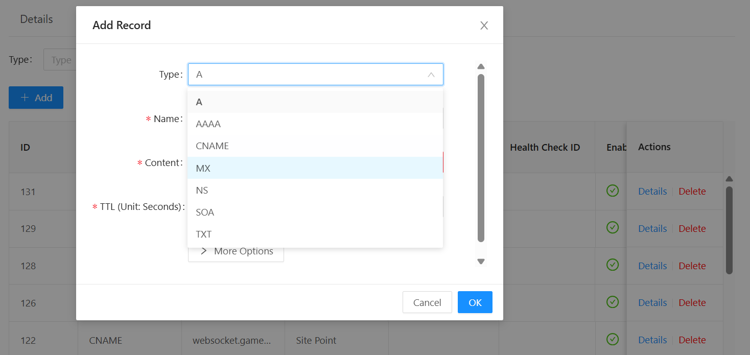 DNS > Domainsection. Click onDetailsto edit the Domain Zone. -