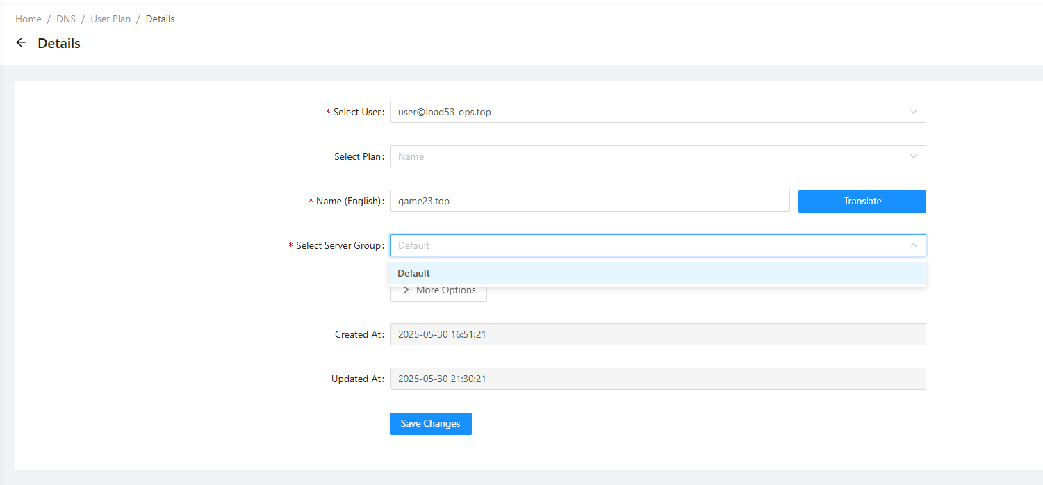 DNS User Plan defines the DNS Server Group as a configuration template of DNS Domain. It also limits how many DNSRecords User can define. Details will be explained in Advanced User Plan Configuration