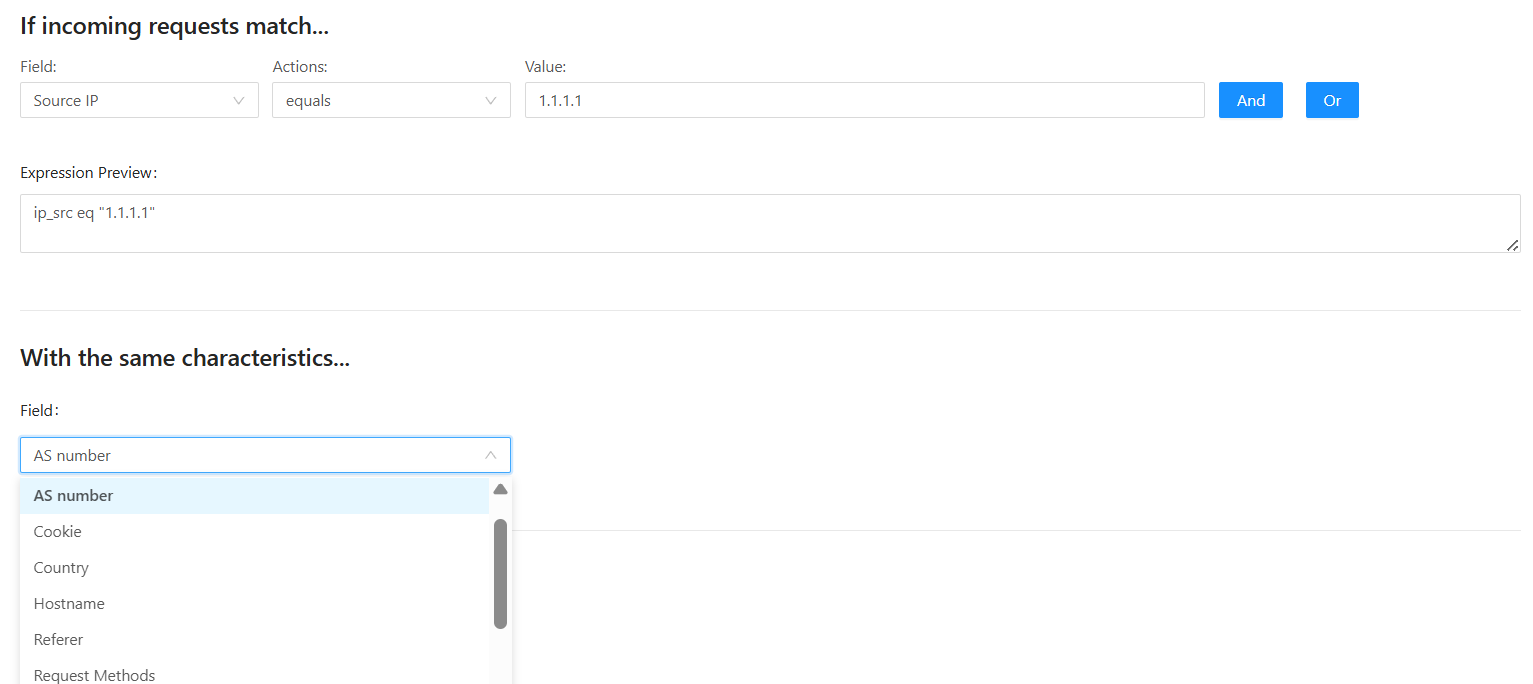 限速规则首先需要定义需要评估的请求类型,其配置方式与防火墙规则类似,支持通过以下字段匹配传入请求: