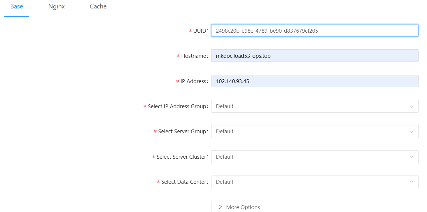 填写与Load Proxy节点对应的值(如主机名、IP地址),选择4个分组设置的相关标签。服务器UUID可在