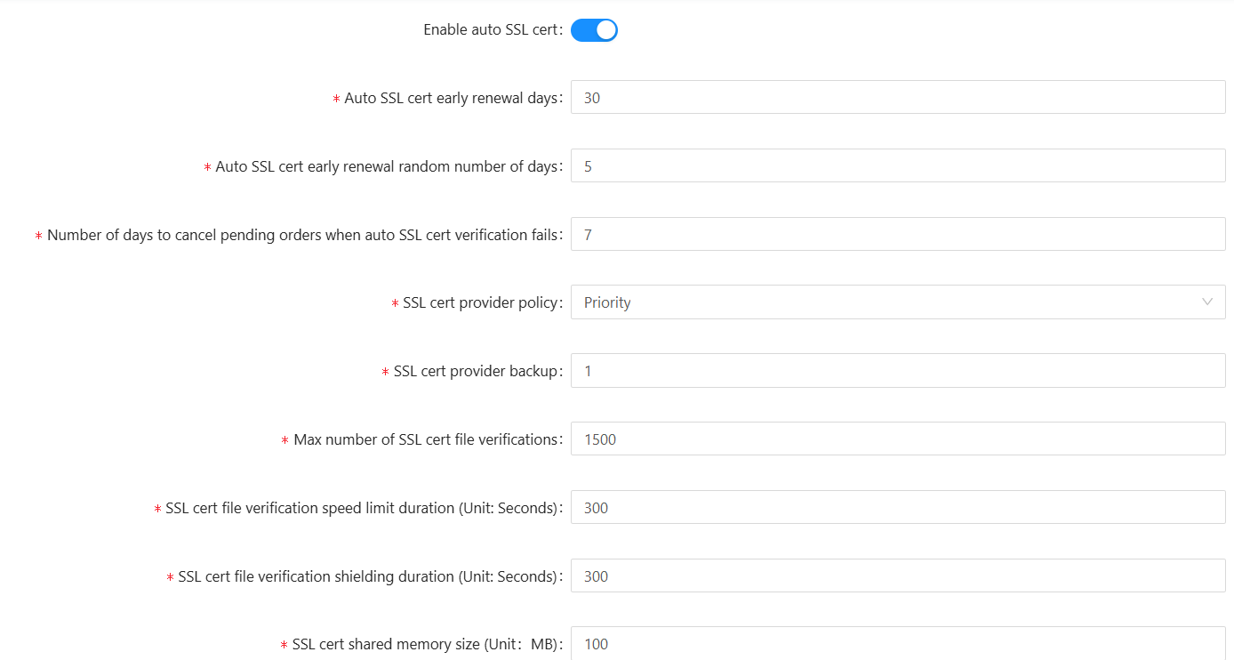 | 自动SSL证书提前续期天数 | 在证书过期前多少天尝试提前续订。 |