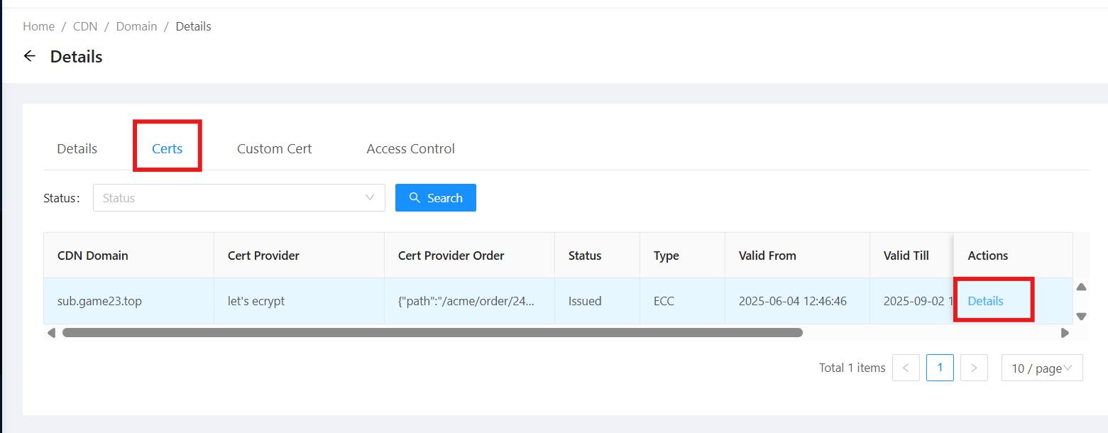 CDN > 域名 > 详情 > 证书部分查看SSL证书申请过程和状态如果仍处于待处理状态,您也可以手动触发SSL证书申请: