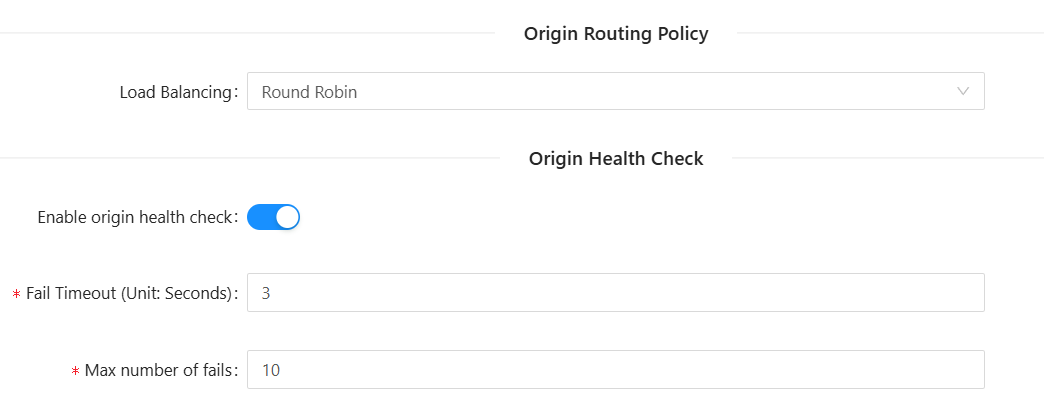 字段 说明 负载均衡 定义请求分发策略 启用健康检查 定期检测源站可用性 失败超时(秒) 标记故障源站后的重试间隔 最大失败次数 允许的最大连续失败次数