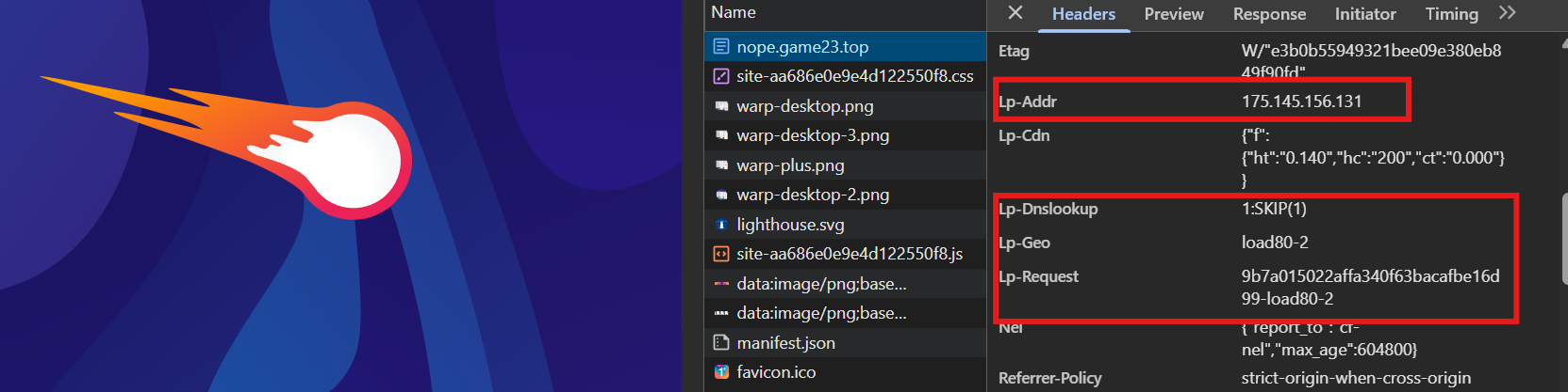 在调试工具的网络选项卡中,您可以看到EdgeHit节点在响应头中添加的额外标头,表明该域名实际上是由EdgeHit CDN提供服务的。