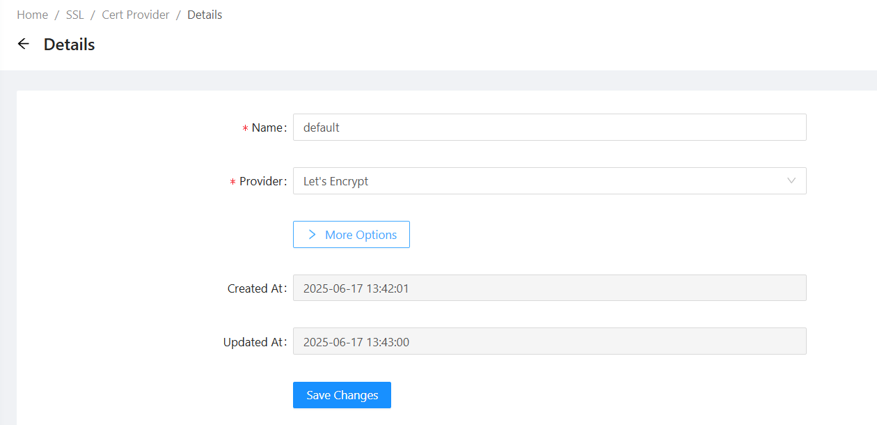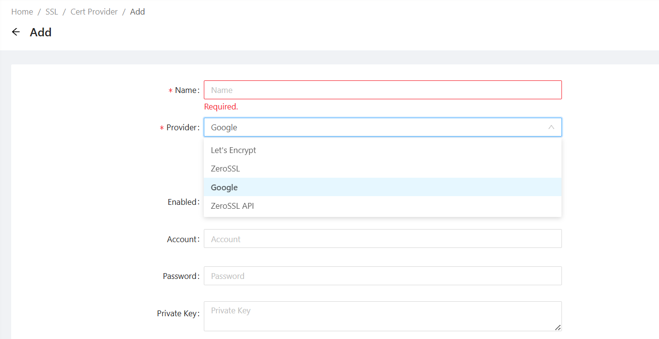 以下是可在 SSL > 证书提供商 > 添加 部分设置的可用SSL提供商选项: