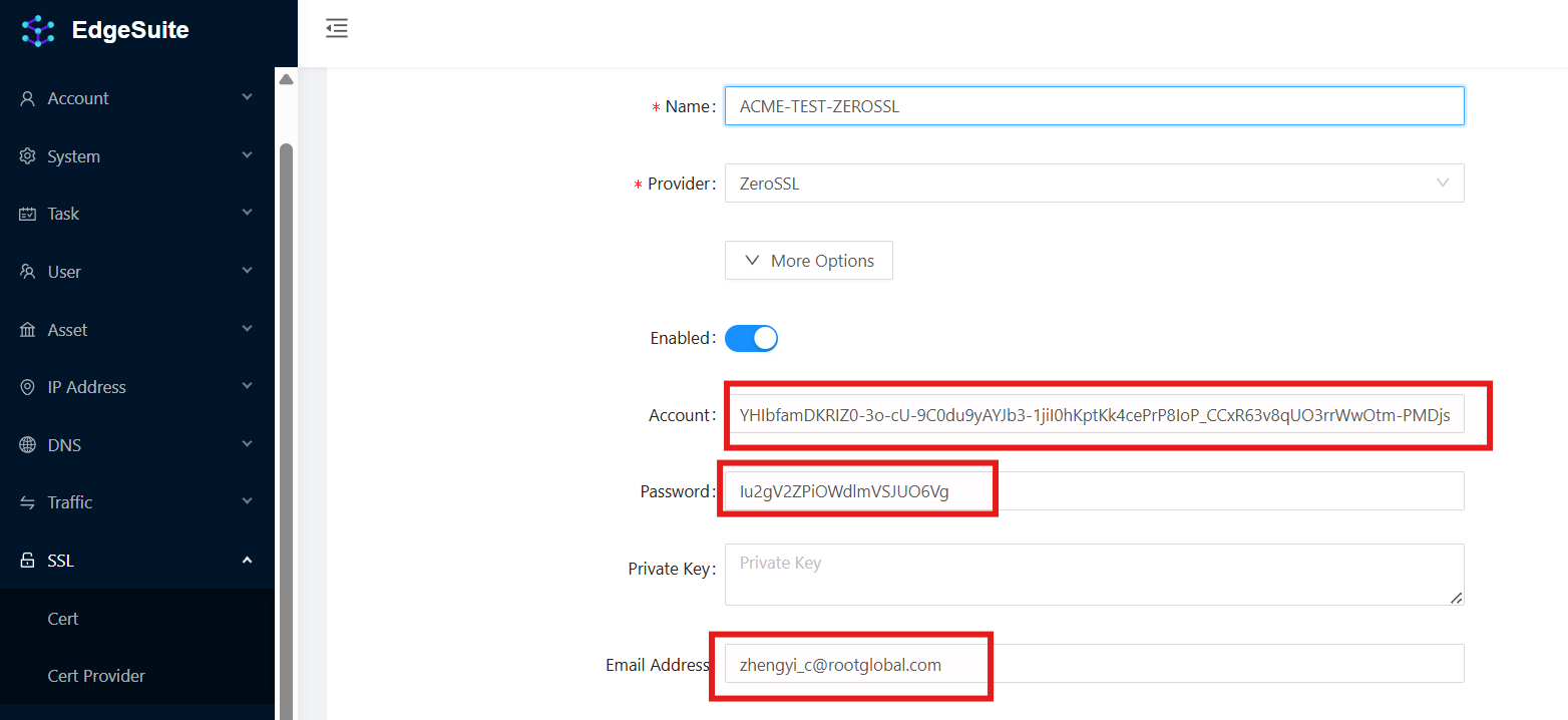 SSL > 证书提供商 > 添加,选择ZeroSSL作为证书提供商。为设置指定一个适当的名称并保存更改。然后填写:- 在==