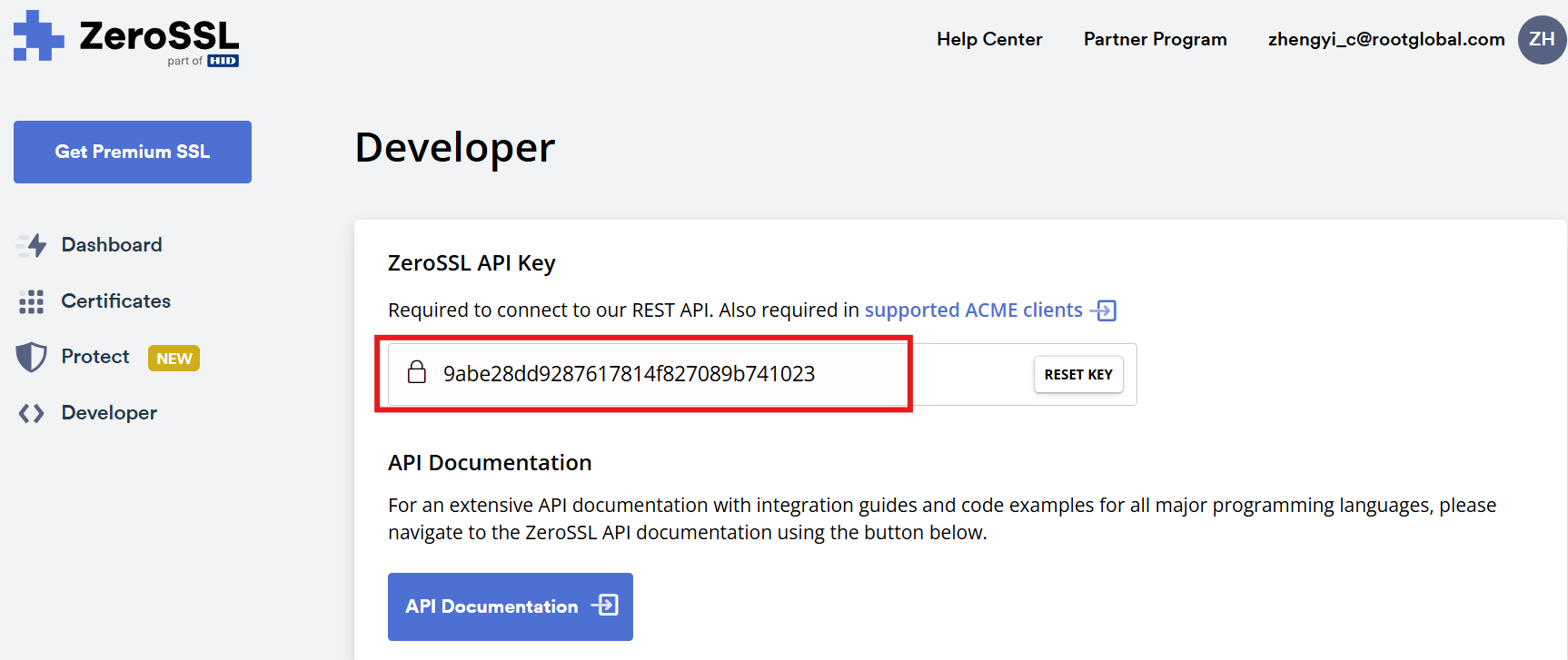 进入ZeroSSL网站的开发者部分,记录提供的API密钥 !!!note "注意" 如果您重新生成API Token,请确保也将edgehit中的设置更改为最新令牌,因为它将使之前的所有Token失效