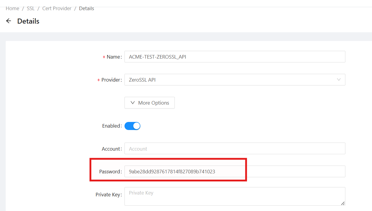 SSL > 证书提供商 > 添加,选择ZeroSSL API作为证书提供商。然后在==密码== 字段中填入API Token。为设置指定一个适当的名称并保存更改。