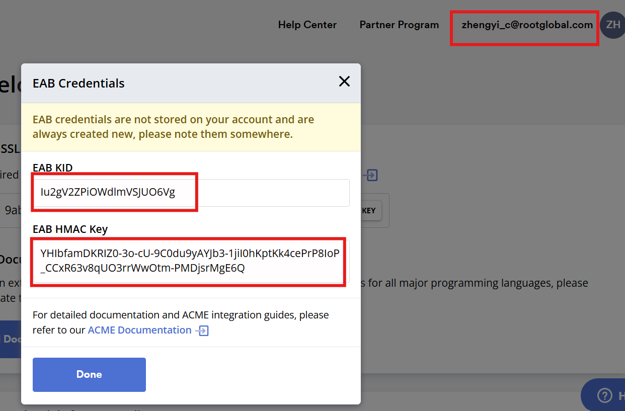 一旦您生成了EAB凭证,旧凭证将被移除且无法再次查看,因此请确保将其本地备份