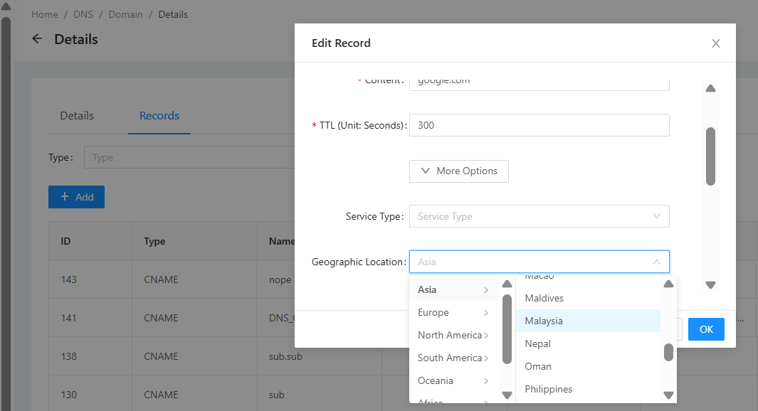 亚洲 > 马来西亚的 CNAME 或 A 记录仅会提供给 DNS 查询源自马来西亚(根据 GeoIP 映射)的客户端。 - 指定区域之外的客户端不会收到此记录,除非定义了回退/默认记录。
